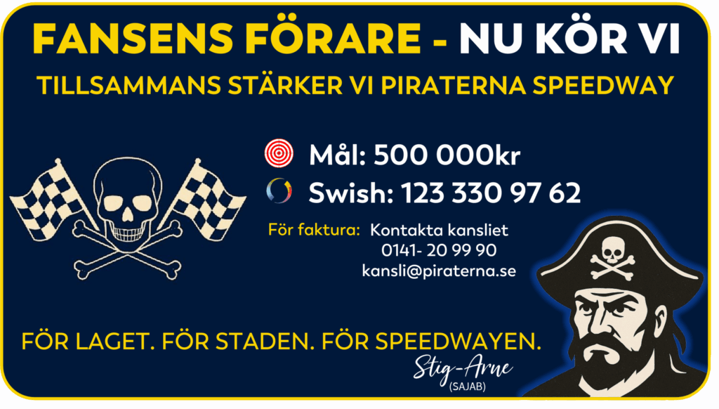 MÅL: 500 000KR SWISH: 123 330 97 62 FAKTURA: kontakta kansliet – 0141-20 99 90 – kansli@piraterna.se Vi samlar in pengar för att hjälpa Piraterna så de kan värva någon eller några förare som det inte finns plats för i deras budget! Varje krona gör skillnad – och tillsammans kan…