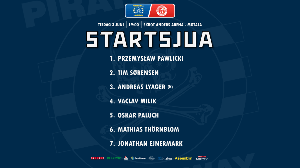 Hemmamatch igen nu på tisdag när Rospiggarna från Hallstavik kommer på besök till Motala. Här är piratlaget som Davidsson/Bylin ställer upp: 1. Przemyslaw Pawlicki 2. Tim Sörensen 3. Andreas Lyager (K) 4. Vaclav Milik 5. Oskar Paluch 6. Mathias Thörnblom 7. Jonathan Ejnermark Se till att komma upp till Skrot…