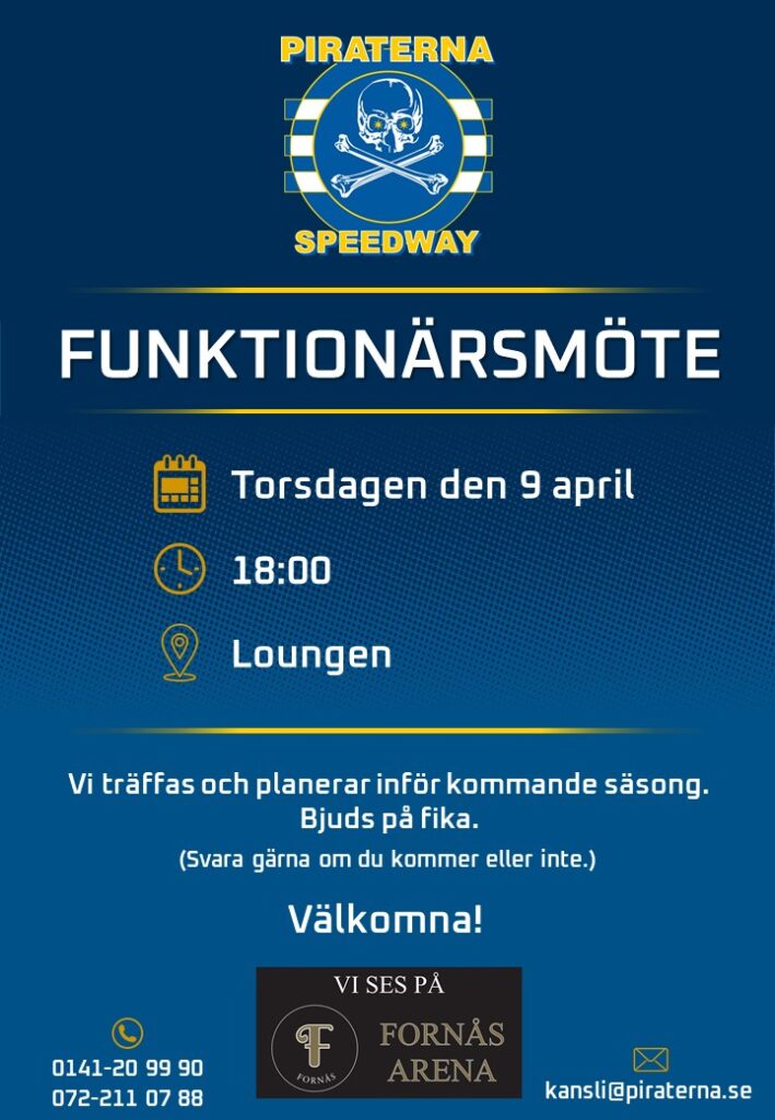 Vi välkomnar alla våra funktionärer till vår Lounge på FUNKTIONÄRSMÖTE 9 april Kl. 18:00 Vi träffas och planerar inför kommande säsong. Bjuds på fika. (Hör gärna av dig o tala om om du kommer eller inte) Välkomna! 0141-20 99 90 – 072-211 07 88 – kansli@piraterna.se