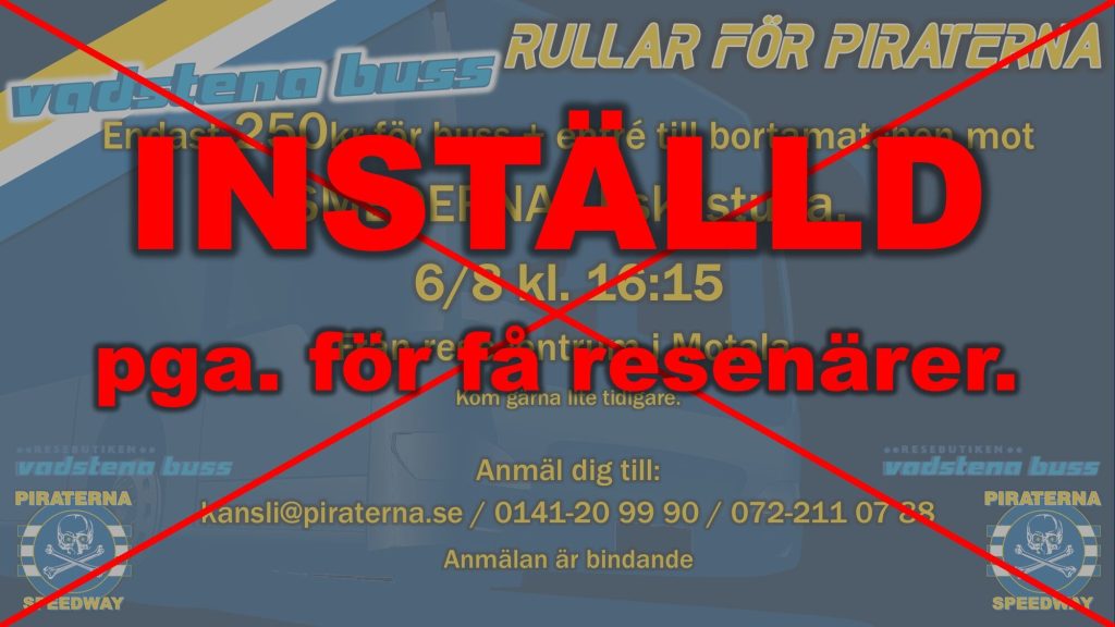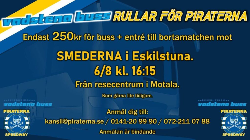 6/8 kl. 16:15 rullar vi från resecentrum i Motala upp till Eskilstuna för att stötta våra förare i bortamatchen mot Smederna För endast 250kr/plats Buss & entré ingår i priset. Anmäl dig till: kansli@piraterna.se eller 0141-20 99 90 / 072-211 07 88 Anmälan är bindande!