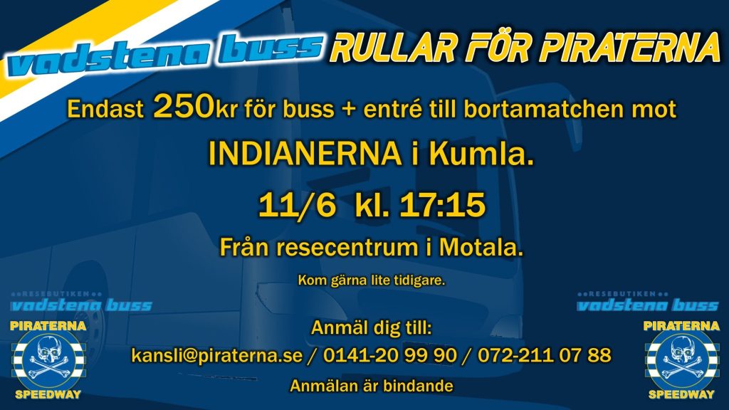 11/6 kl. 17:15 rullar vi från resecentrum i Motala upp till Kumla för att stötta våra förare i bortamatchen mot Indianerna För endast 250kr/plats Buss & entré ingår i priset. Anmäl dig till: kansli@piraterna.se eller 0141-20 99 90 / 072-211 07 88 Anmälan är bindande!